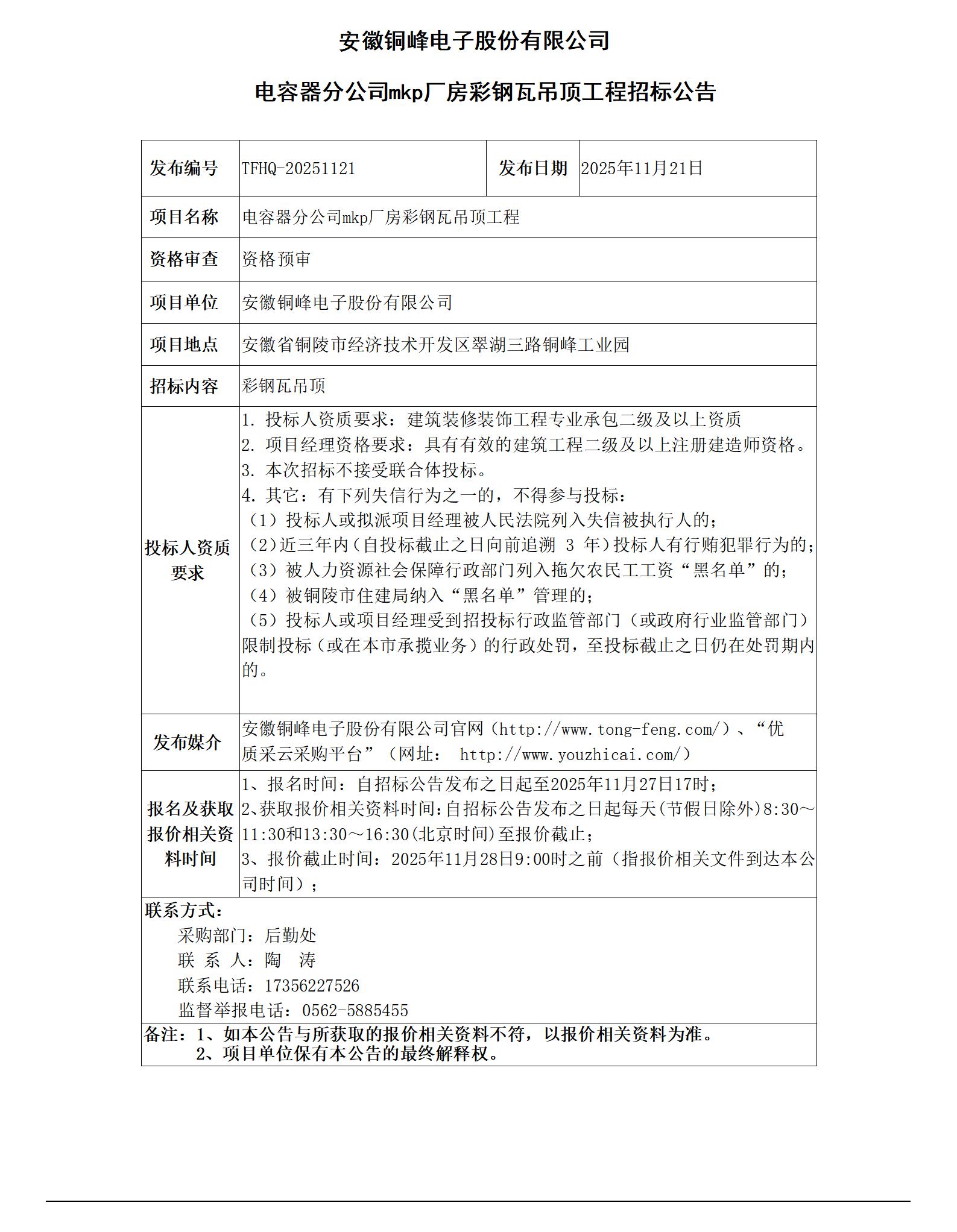 安徽銅峰電子股份有限公司 (電容器分公司mkp廠房彩鋼瓦吊頂工程 招標公告)_01